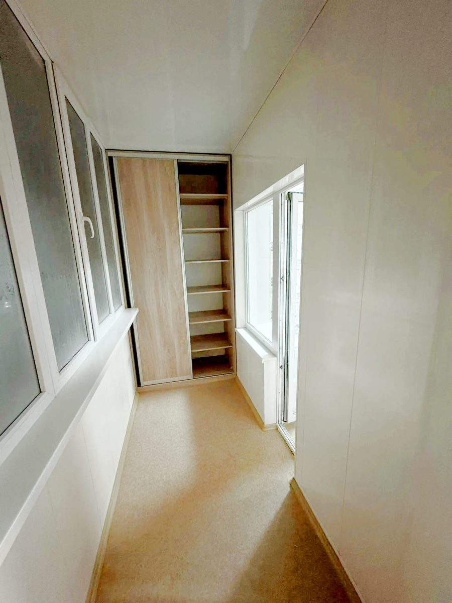 В квартире есть балкон, где можно наслаждаться свежим воздухом. Балкон облагорожен, вставлены пластиковые окна, встроен шкаф купе.