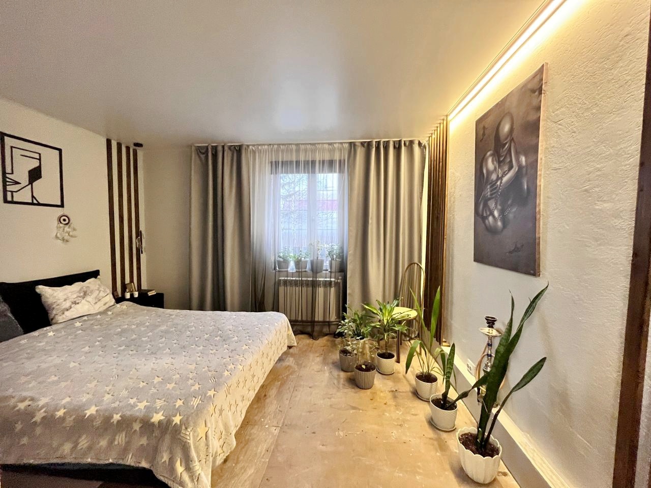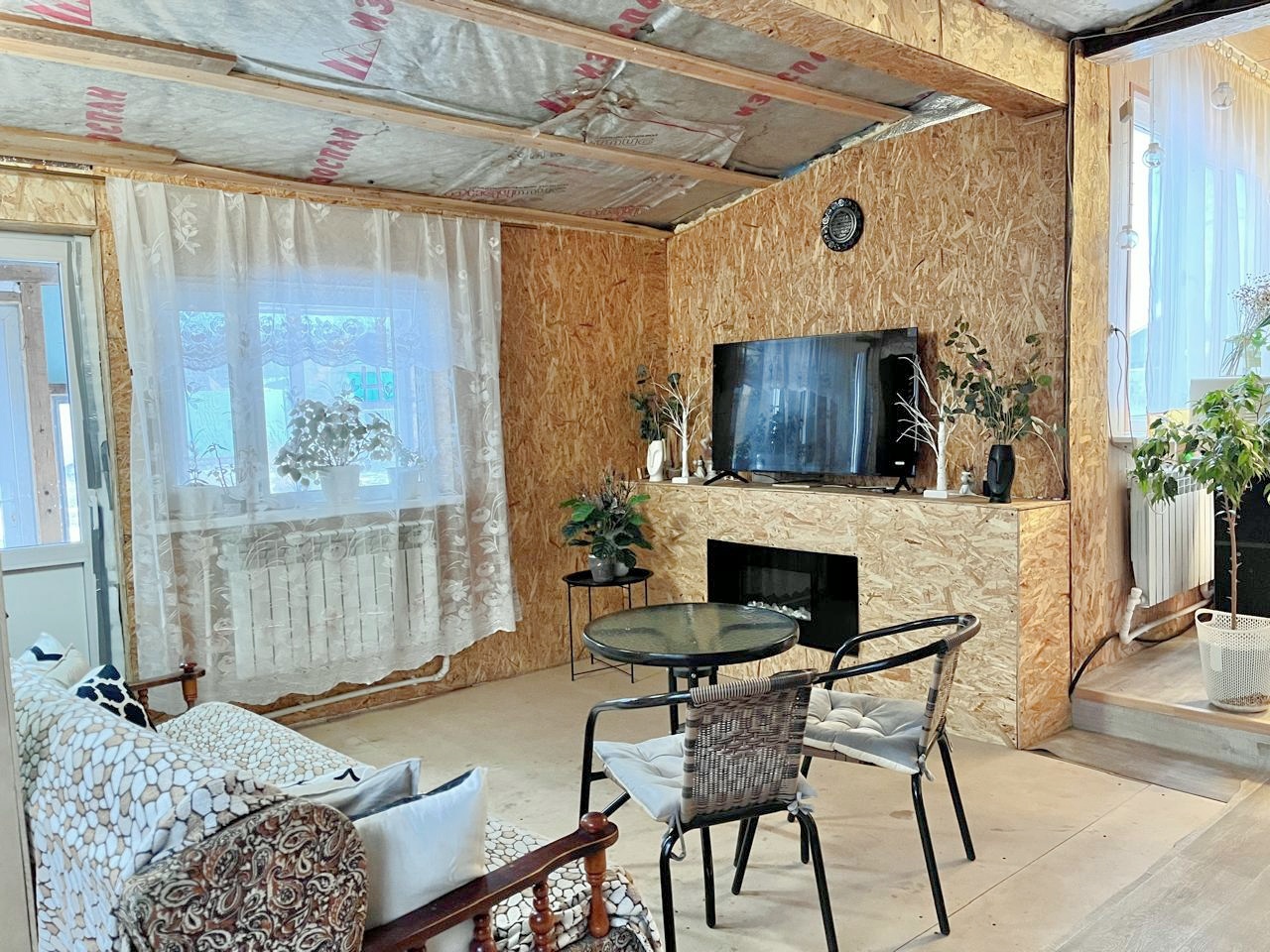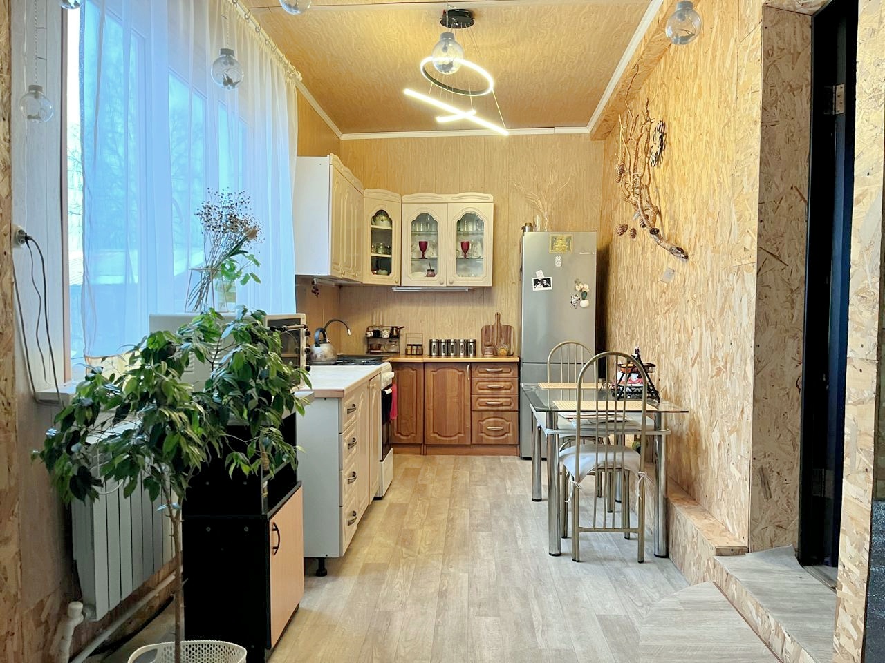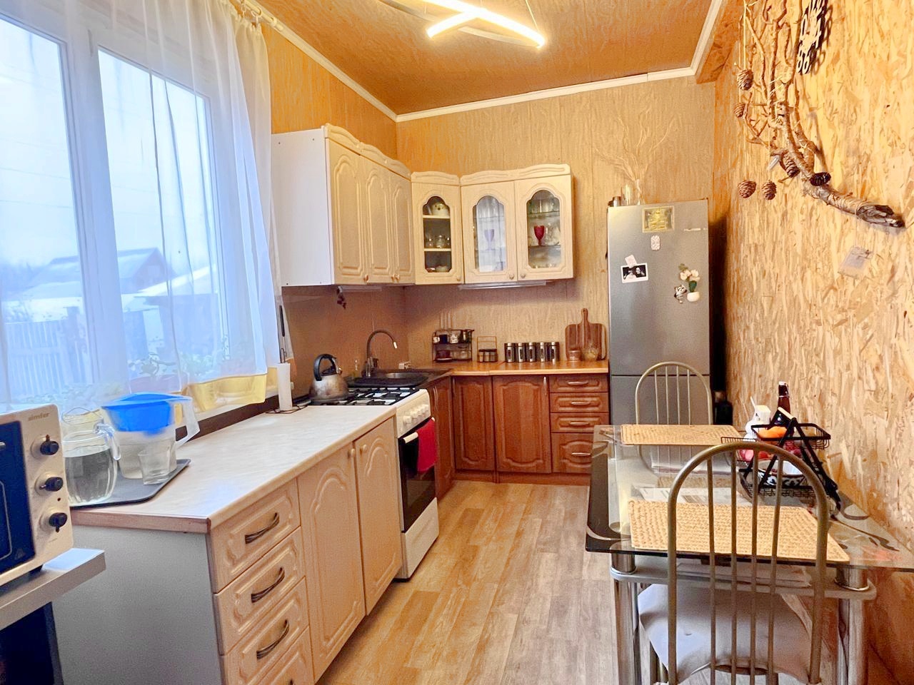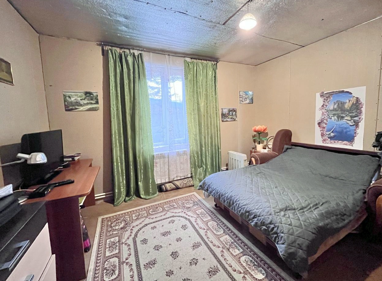 Двухэтажный дом из сэндвич панелей, утеплен и обшит проф листом. К дому пристоен крытый гараж. Площадь первого этажа 150 м.кв.(просторная кухня гостиная, 4 комнаты, гардеробная, сан. узел, веранда), второй этаж мансарда не обустроен. В доме проживают круглогодично, отопление электрокотёл. Скважина заведена в дом, канализация - септик. Частично выполнен ремонт, необходимые вложения видны на фото. Требуется установка сан. техники. Мебель остаётся частично.